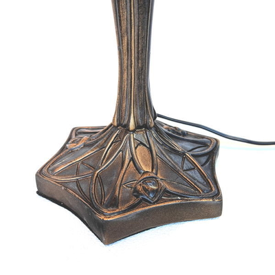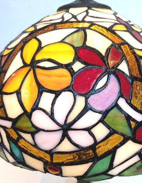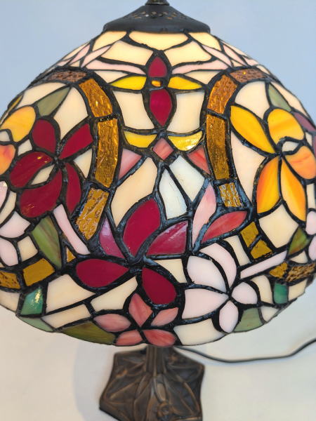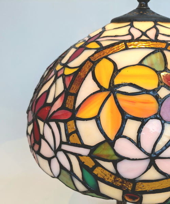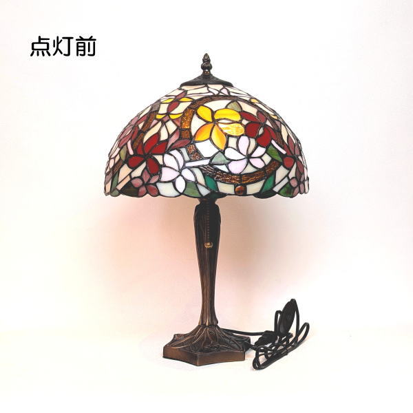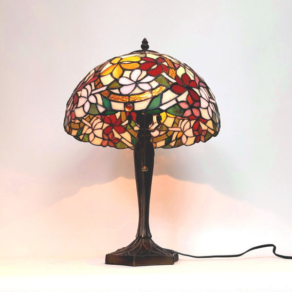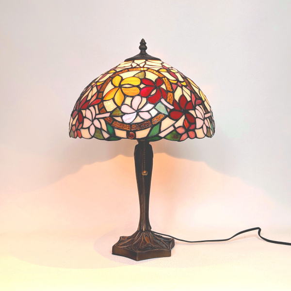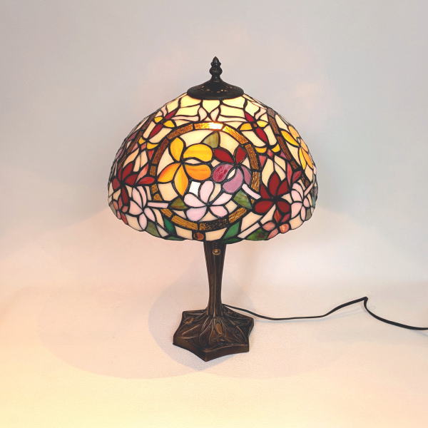 暖色系のやわらかな色合いが魅力のステンドグラステーブルランプです。 全体に華やかなトーンでまとめられており、優しい灯りが空間を包みます。 程よいサイズ感で、贈り物にも最適です。