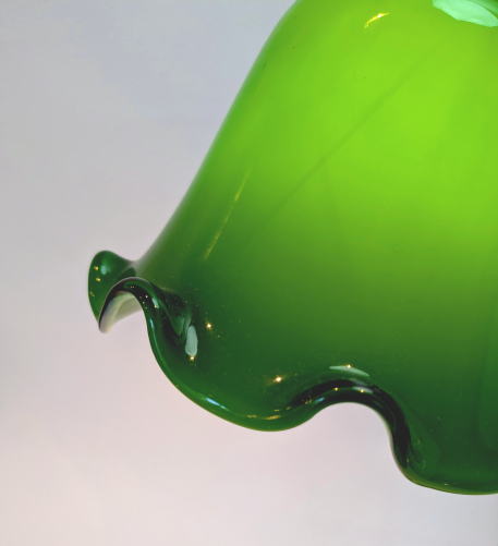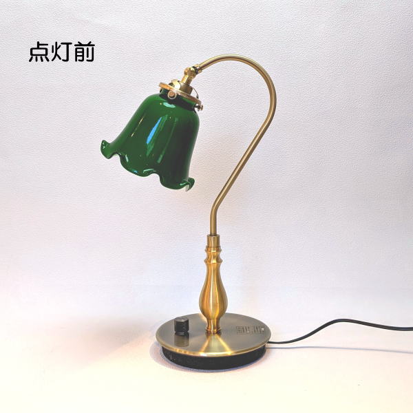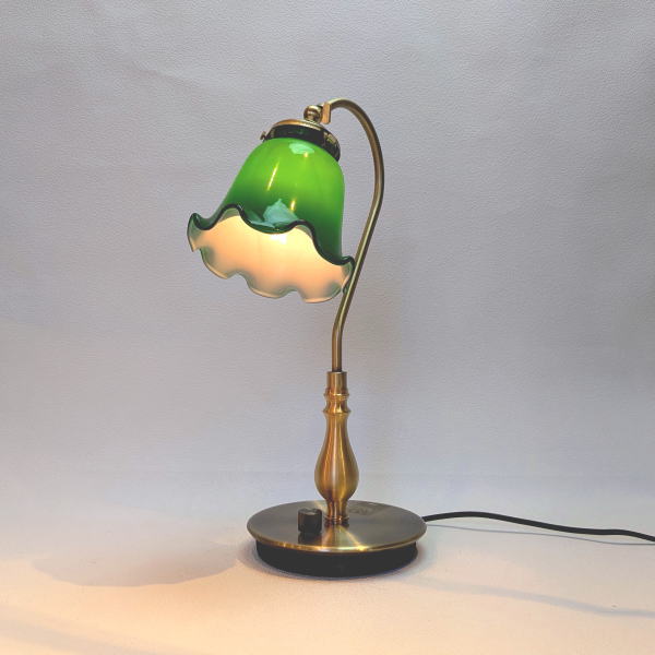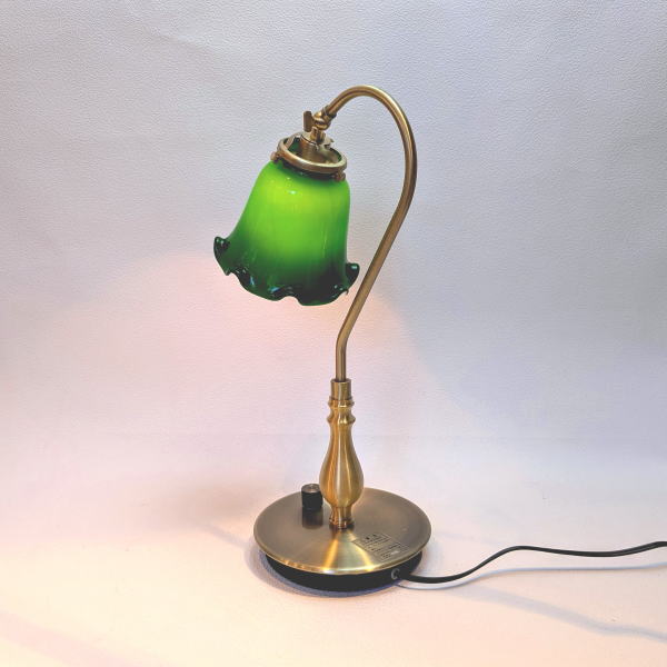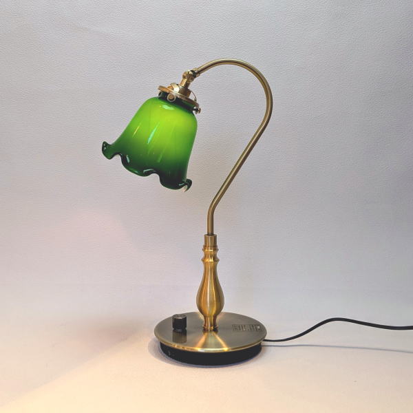 光を透かす深みのあるグリーンのガラスシェードと、クラシカルな佇まいの支柱が印象的なテーブルライトです。