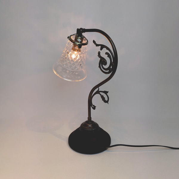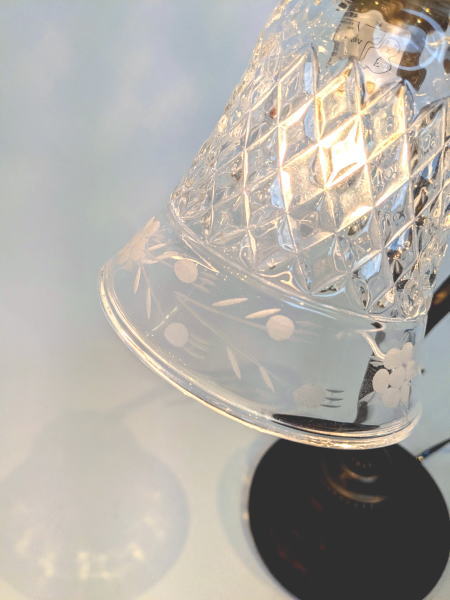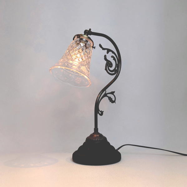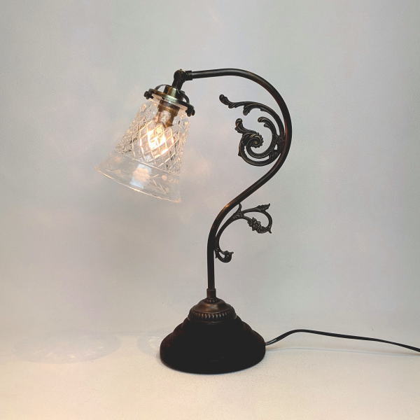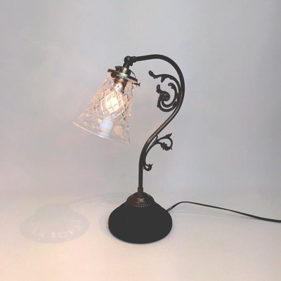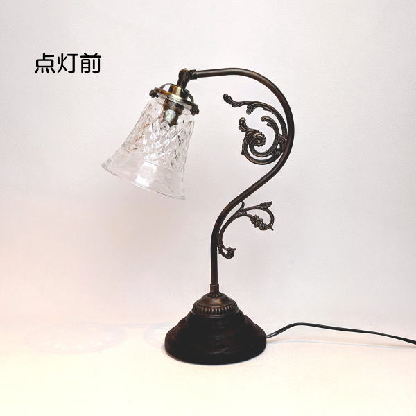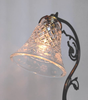 ガラスに施された繊細なカットと、裾に描かれた切子風の花模様が、温かな灯りとともに癒しの空間を演出します。 アンティーク調の灯具とガラスが調和し、独特の趣を感じさせるランプです。