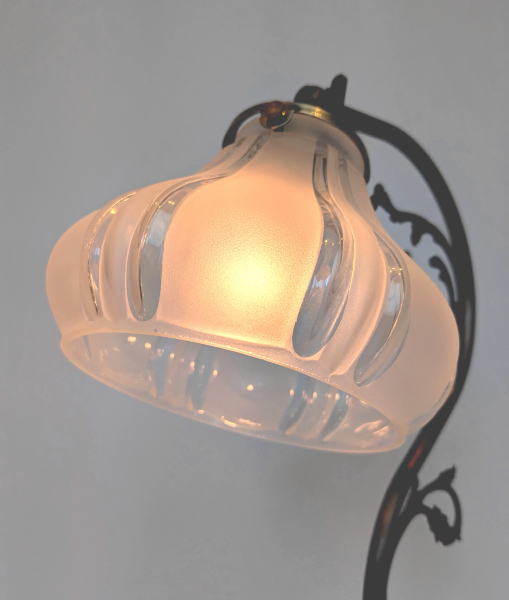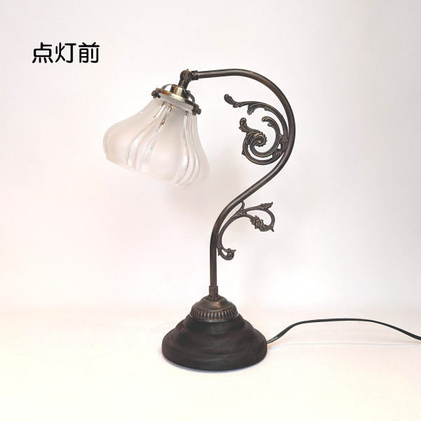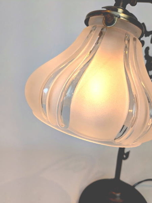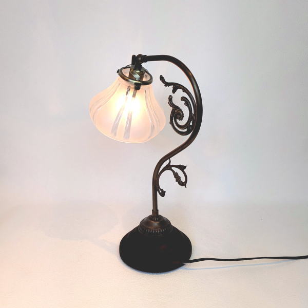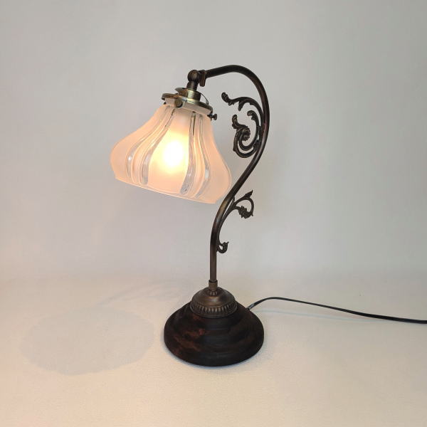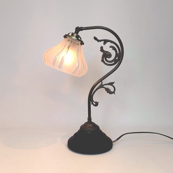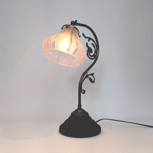 優雅なスワン型灯具に、クリアガラスとフロストガラスを組み合わせたシェードが特徴のテーブルライトです。