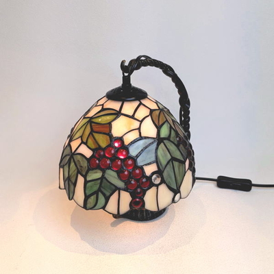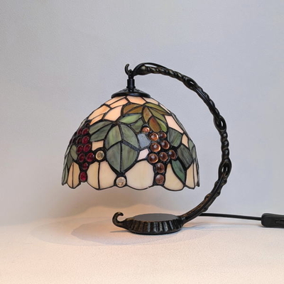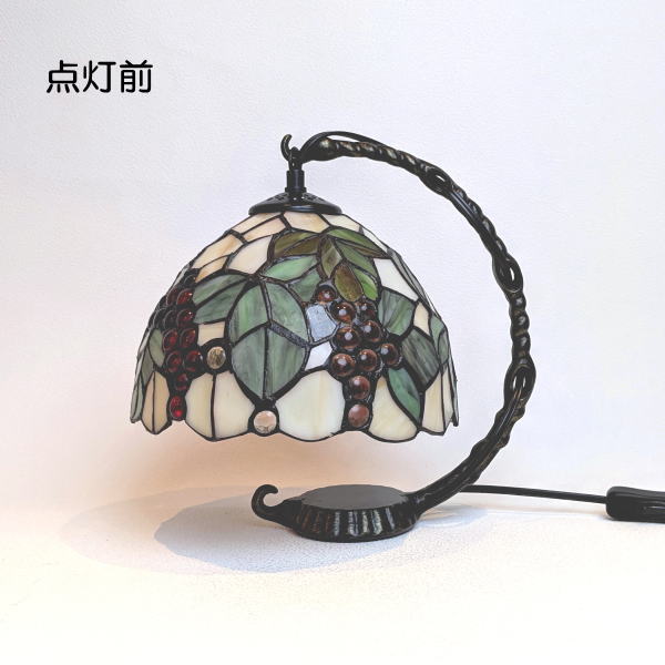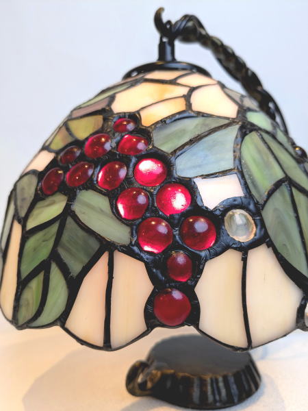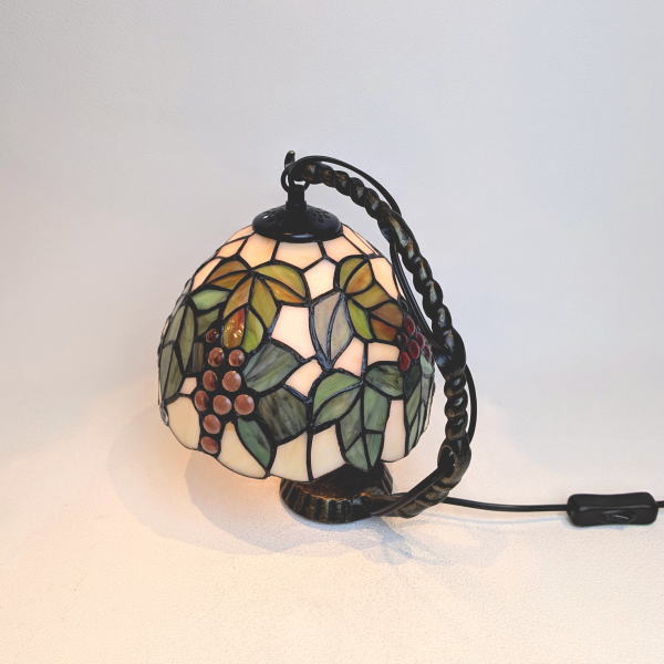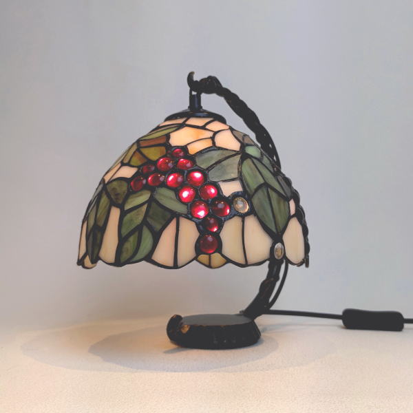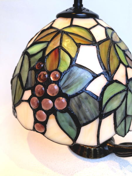 彩り豊かなガラスで描かれた葡萄の実と葉が美しく映える、釣鐘型灯具のステンドグラステーブルランプです。