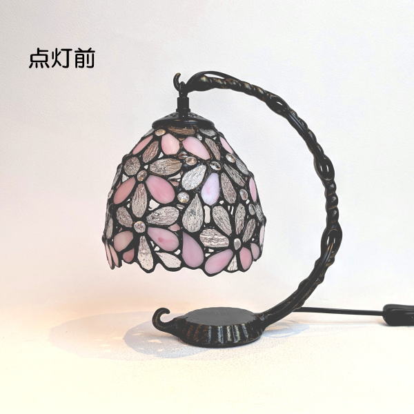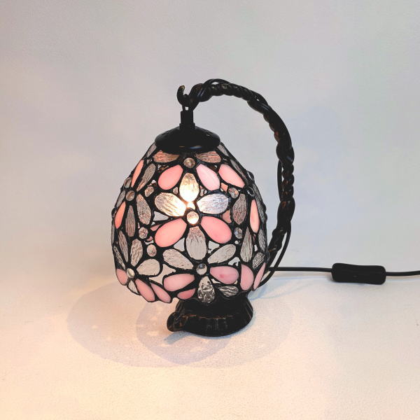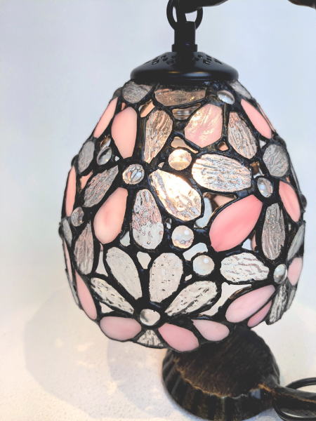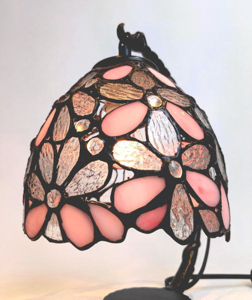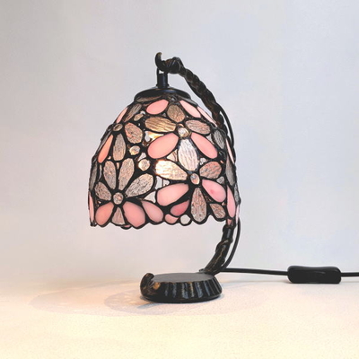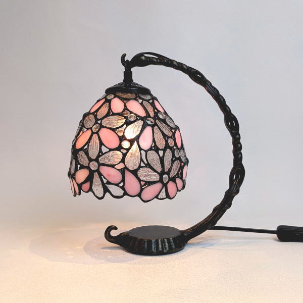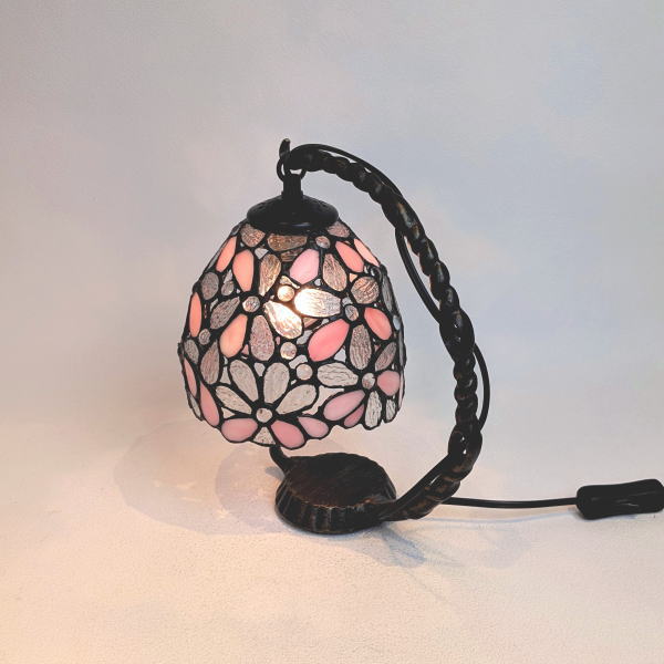 丸みのあるシェードに、ピンクの花びらを模した釣鐘型灯具のステンドグラステーブルランプです。